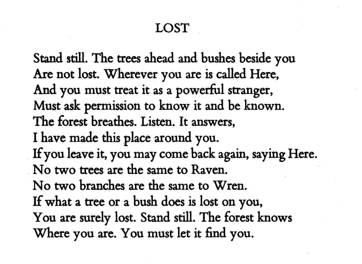 "If what a tree or a bush does is lost on you / You are surely lost."